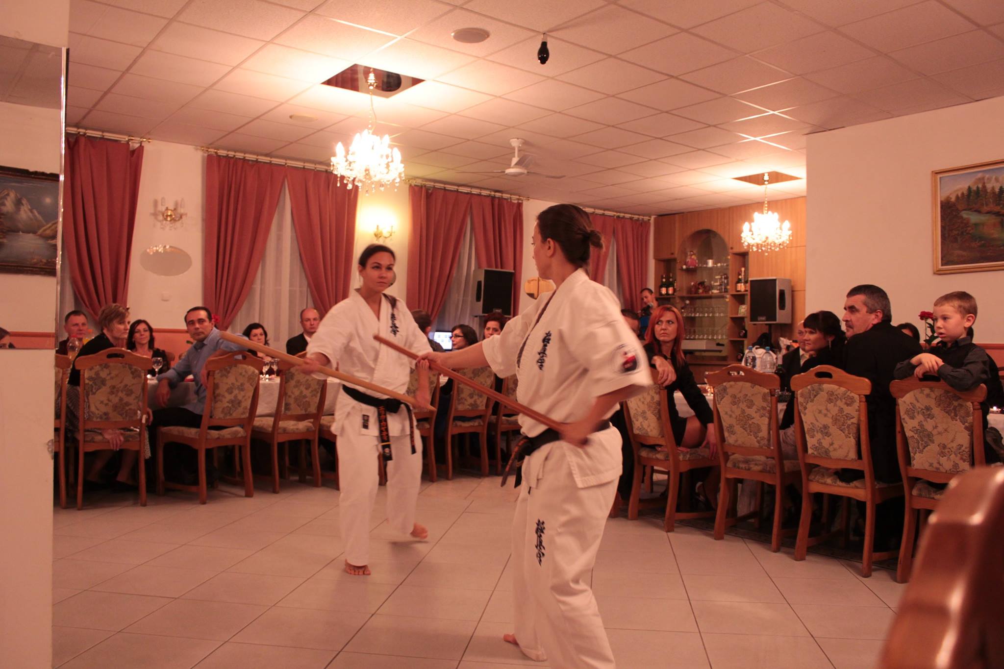 Idén november 22-én ismét megrendezésre került a már hagyományos Karate Bál. A két rendező, Juszkuné Hogya Viktória és Fábrikné Király Klára egy nagyon hangulatos estét szervezett számunkra. Munkájukért köszönet minannyiunk nevében! Az elnöki köszöntő után színvonalas műsor következett, melyben csapatunk több tagja is jeleskedett. Ambrus Baltazár zenével, Krizsó Nikoletta és Kajati Erika pedig egy Jo (rövid bot) bemutatóval szórakoztatták a közönséget. Ezen kívül még egy ifjú társastánc páros mutatta be tudását és megmutatták, hogyan kéne a jelenlévőknek ropni a táncot. A tánc előtt azonban még az egyesületi torta követtkezett, amelyet a Kövér Cukrázda ajánlott fel és nagysága miatt nem volt egyszerű felszeletelni. A vacsora és a torta után jöhetett a tánc, amit csak a tombola húzása szakított meg egy kis időre.